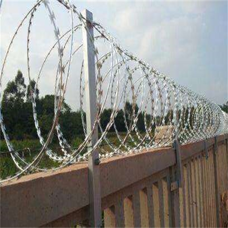 鋁包鋼刀片刺繩也叫生銹刀片刺繩是由鋁包鋼絲為原料生產的一種新興刀片刺繩,其產品較一般刀片刺繩來說質量輕、強度高、美觀、耐用。  主線采用250絲的純鋼絲,外面再包上50絲的鋁,這樣可以防止生銹。鋁的比重是鐵的三分之一左右,鋁包鋼刀片刺繩是純鋁絲制作的,刺繩的切口也不會因此而生銹的,這樣解決了刀片刺繩工序中的一大難題,雖說鋁的價格高高在上但是比重低,單位米數會長,合成本比普通熱鍍鋅差不多少的。以后大家需要在環境十分惡劣的情況下又有了一種新的選擇。