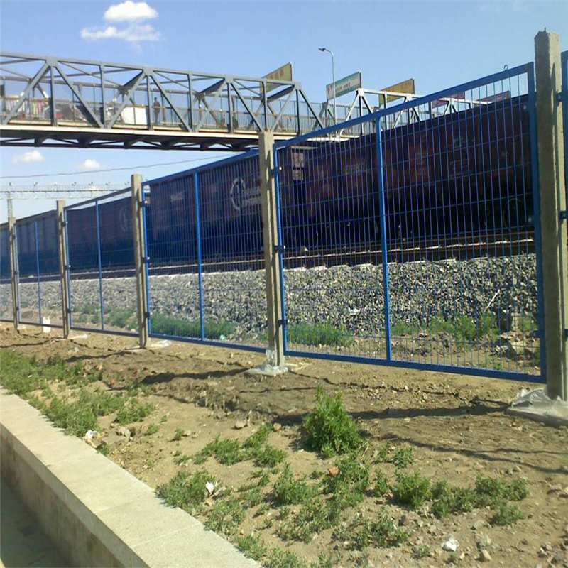 高鐵防護柵欄為冷拔鋼絲點焊熱鍍鋅再熱浸塑網片,外型尺寸為2760*1790mm,網格尺寸為75*150mm,鋼絲為φ4mm , 網片邊框采用30*50mm的方管焊接而成,防盜螺栓的螺柱、螺帽、墊圈等作熱鍍鋅處理。高鐵防護柵欄表面采用熱浸塑處理,顏色為墨綠色,整個結構表面平整光滑,色澤均勻,無漏鍍、開裂、脫皮及脫落等缺陷。網片浸塑所用的材料及PE表層環保性好,無污染。網片上方加裝蛇腹形滾刀網,有效的防止攀爬。