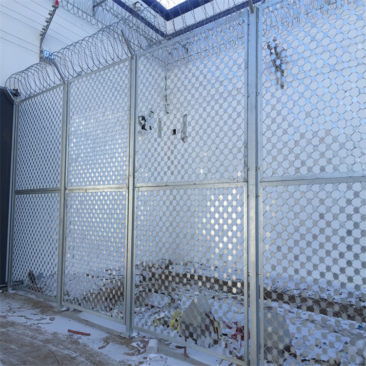 將不銹鋼拉絲固定在隔離網(wǎng)的頂部,形成一個(gè)v型托網(wǎng)用于架設(shè)蛇腹形刀刺網(wǎng),將刀刺網(wǎng)按照12cm的間距均勻鋪設(shè)在v型支架上,用不銹鋼防拆卸卡扣與v型托網(wǎng)上的不銹鋼拉絲固定。在安裝完成后,對(duì)梅花刺片隔離網(wǎng)的防攀爬性能,進(jìn)行跨越、防破壞測(cè)試。