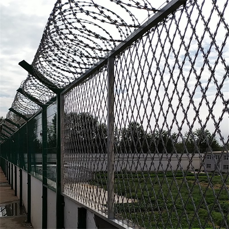 監(jiān)獄鍍鋅隔離網(wǎng)是可以透過(guò)網(wǎng)孔觀察內(nèi)部以及監(jiān)獄內(nèi)外的情況的,采用高強(qiáng)度的刀刺蛇腹網(wǎng)與普通防護(hù)網(wǎng)的結(jié)合,由V型支架立拄,加強(qiáng)型焊接片網(wǎng)等組成。