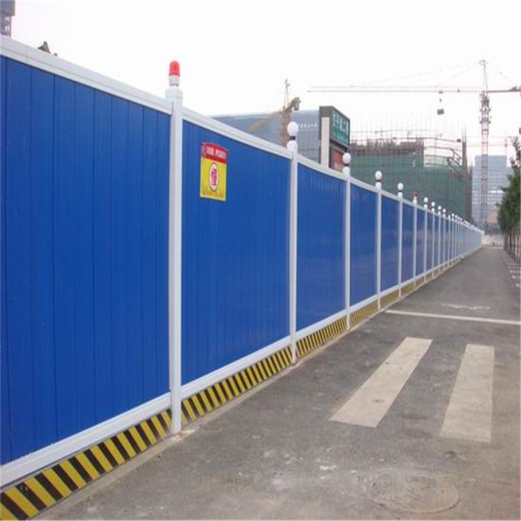 道路施工圍擋方鋼柱及鍍鋅鐵皮噴涂深藍色油漆(c100,m80,y0,k0)。立柱為(尺寸100×100×3mm)方鋼,立柱間距3000mm,外側立柱頂設警示燈,內側立柱設頂燈,需預留燈具裝置位置。
