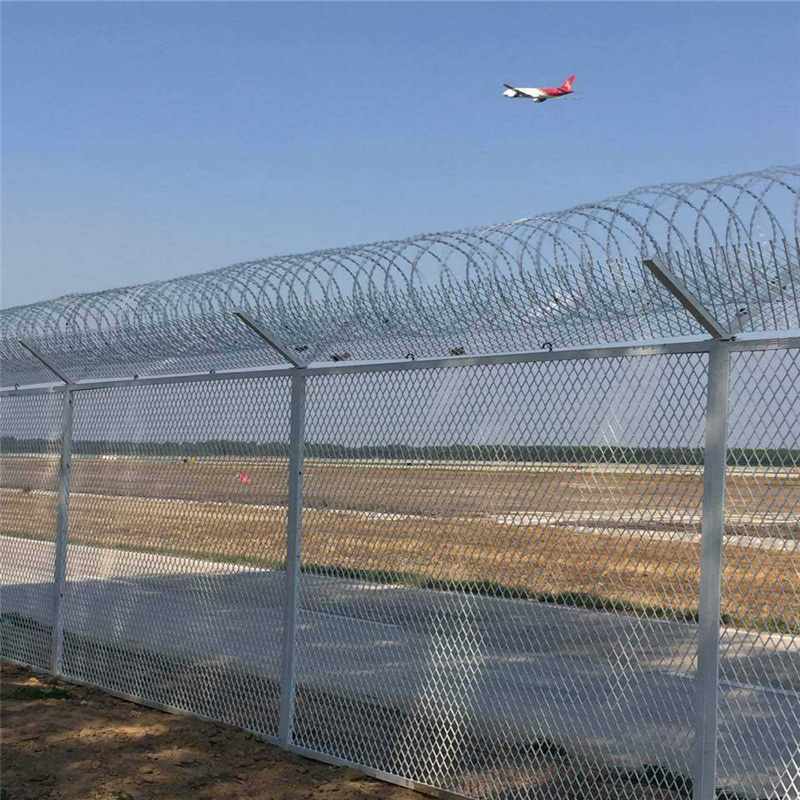 機場隔離柵經由鍍鋅和高附著力粉末浸塑二層維護的焊接式網片,具有日久防腐蝕,防紫外線的特性。機場隔離柵立柱:外表處置為鍍鋅和浸塑,也能夠任選一種,頂端蓋有塑料蓋或防雨帽,依據環境和裝置方式的不同。
