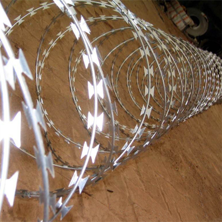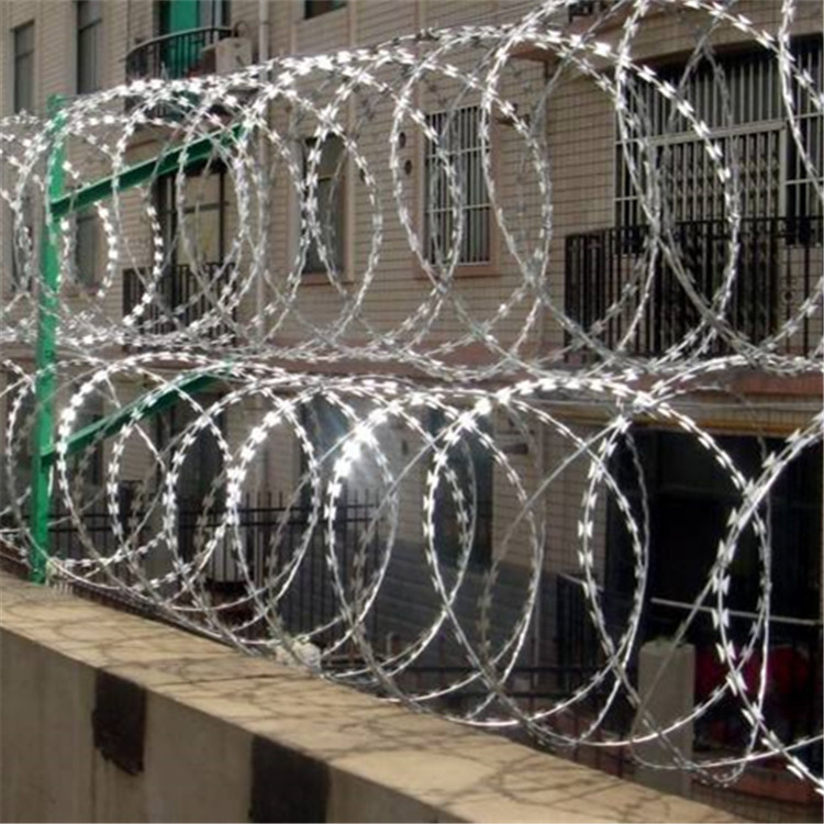 蛇腹型刀刺網工藝由熱鍍鋅鋼板或不銹鋼薄板沖壓出尖利的刀片狀,高張力鍍鋅鋼絲或刀片刺繩者不銹鋼絲做芯線組合而成的阻絕器件。于剌網造形共同不易接觸,因此能抵達好的防護阻隔作用。產品的首要原料有鍍鋅板和不銹鋼板。