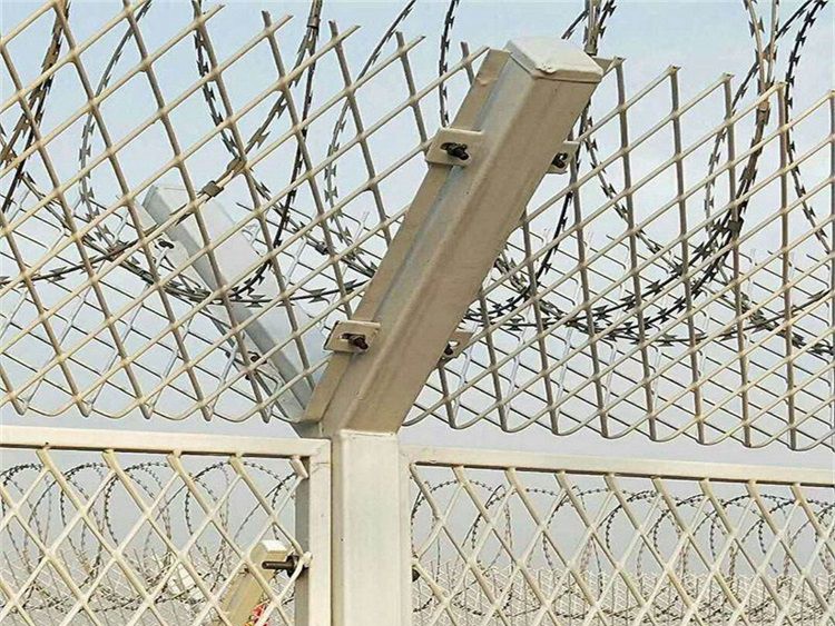 機場圍界區隔離網又稱作“Y型安全防御護網”,是由V型支架立柱,加強型焊接片網,安全防盜連接件和熱鍍鋅刀片刺籠組成強度和安全防御性級別很高。近年來,被廣泛應用在機場,軍事基地等高安全場所。注:如果在機場護欄網頂部加裝刀片刺絲、刀片刺繩后又很好的增強了安全防護性能。采用電鍍、熱鍍、噴塑、浸塑等防腐形式,具有很好的防老化、防曬、防候等特點。其產品造型美觀、花色多樣,既起到圍欄作用,又起到美化作用。由于具有安全性高、防攀爬能力好,網片連接方式采用特制SBS緊扣件,有效防止人為的破壞性拆卸,橫向四道折彎加強筋,使網面強度顯著增加。