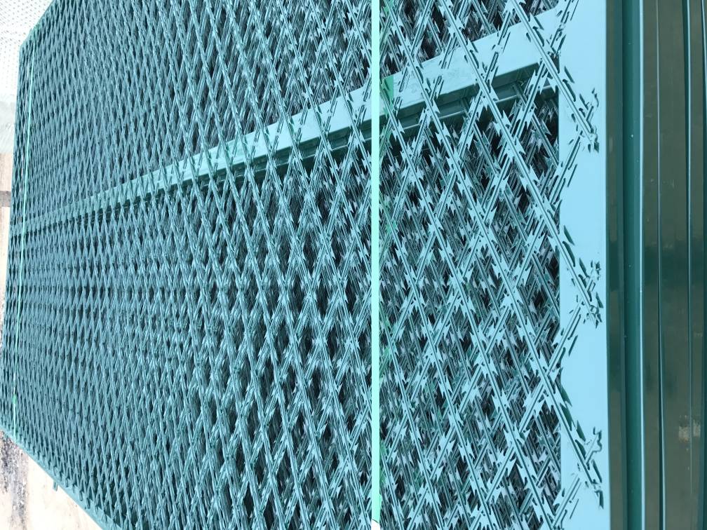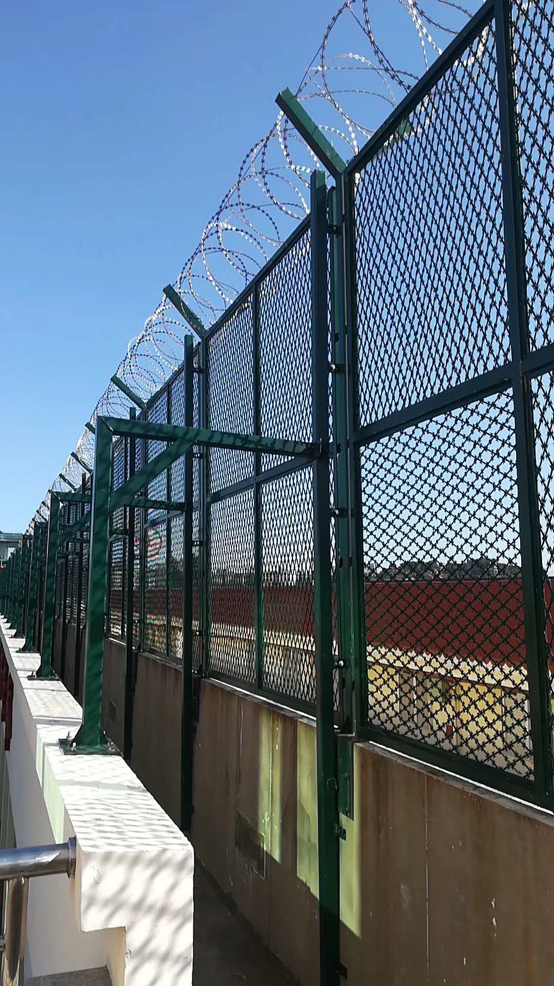 熱鍍鋅金屬監(jiān)獄鋼網(wǎng)墻主要是選用高強(qiáng)度的刀片刺網(wǎng)與普通防護(hù)網(wǎng)的結(jié)合,由V型支架立拄,加強(qiáng)型焊接片網(wǎng),安全防盜銜接件和刀片刺網(wǎng)組成.一種新型防護(hù)網(wǎng),由銳利尖角鍍鋅鋼板或不銹鋼薄板做刀片,鋼絲做芯線組合而成的防護(hù)器件. 監(jiān)獄鋼網(wǎng)墻刀片刺網(wǎng)具有嚇阻、防翻越等作用,原料堅(jiān)固,高強(qiáng)度,高張力,造型設(shè)計(jì)共同,不宜觸摸,因而能到達(dá)極好的防護(hù)阻隔作用。