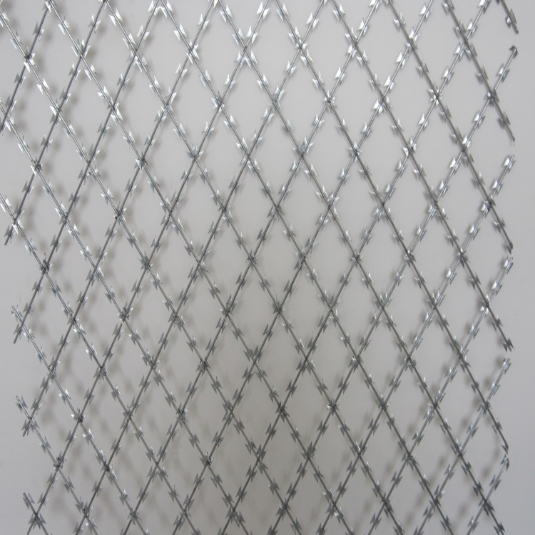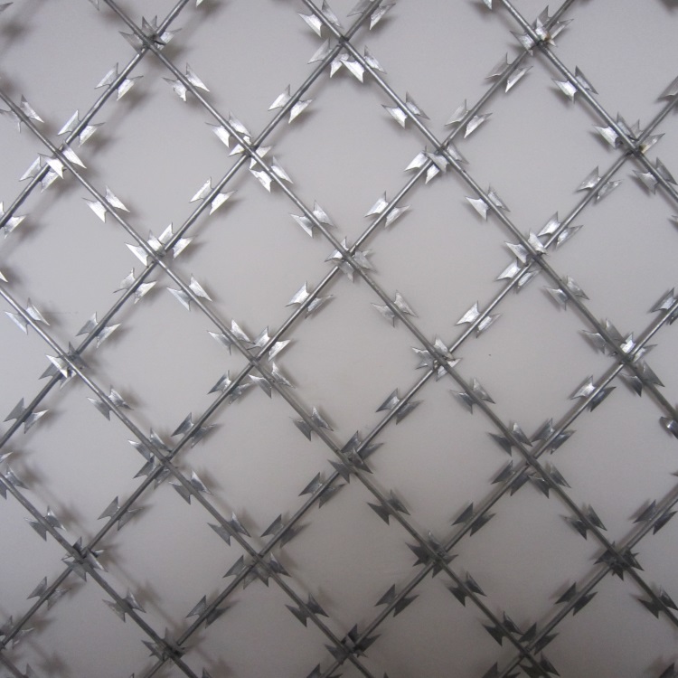 焊接刀片刺網網片菱形狀刺網,至于上下螺旋刀片刺網的中間部分,形成的網片是20CM *15CM 孔的刺網片,高度上具有防攀爬,抗沖擊,高安全防護特性特性,刀片刺網和蛇腹網結合使用,使人望而卻步,擊破人的僥幸心理。
