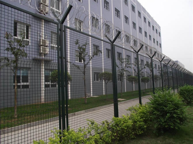 監獄通透式防爬網,高圍墻頂端鋼網墻由鋼絲網片、立柱及安裝底座法蘭盤三部分組成。