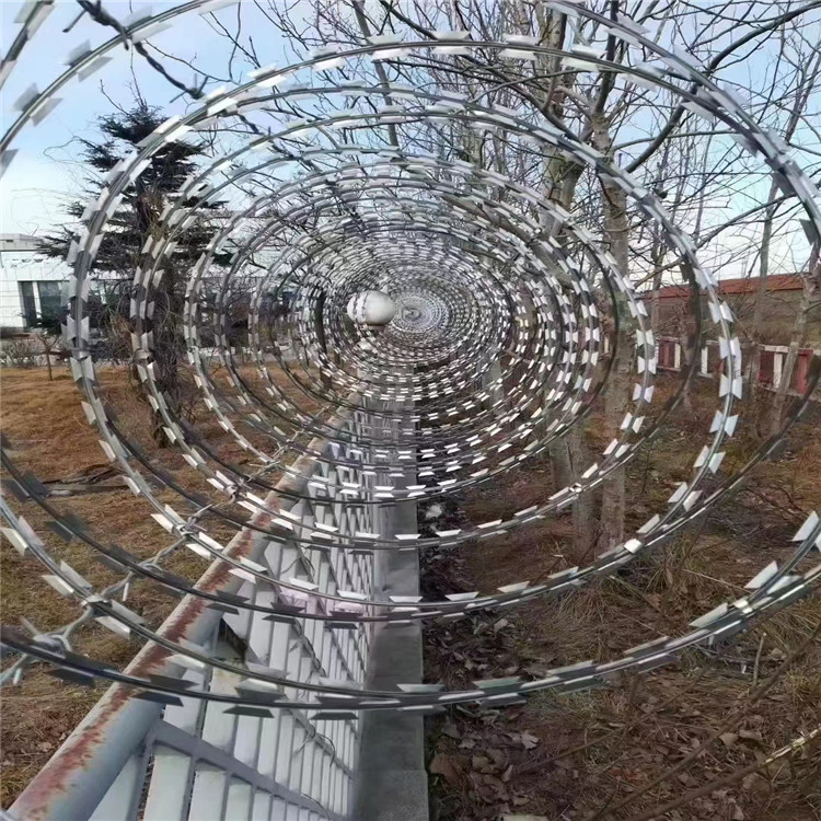 刀片滾籠型號分為BTO系列和CBT系列,國內(nèi)通常選用BTO-22型號。22代表的是刀片的長度。具體形狀如上圖,鋒利是刀鋒使人不寒而栗。關(guān)于安裝固定:一邊選中支架固定。刺絲滾籠用在鐵路上一般用立柱支架和加密支架固定刀刺網(wǎng)。用在其他場所多用V型支架固定以確保刀片滾籠的穩(wěn)定性。綜上所述,如果對于選中刀片刺繩你還有疑問,可來電溝通!