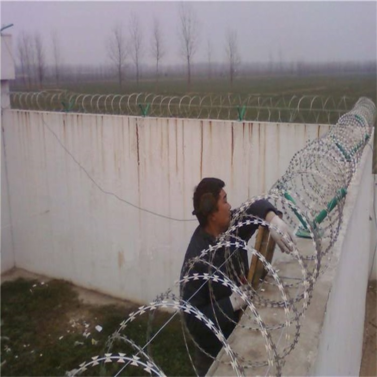 螺旋交叉型刀片刺網(wǎng)在安裝過程中,可根據(jù)圍墻的長度設(shè)計(jì)需要使用多少根Y字型支架,一般為5-10米間距為宜,把Y字型支架固定在圍墻上面,其中Y字型支架可根據(jù)實(shí)際情況進(jìn)行打孔,從而安裝刺絲的時(shí)候起到固定作用。之后在刺絲的Y字支架兩邊各拉一根鋼絲,對(duì)刺網(wǎng)進(jìn)行固定,避免左右晃。在安裝刺絲的時(shí)候要注意安全,避免不必要的劃傷