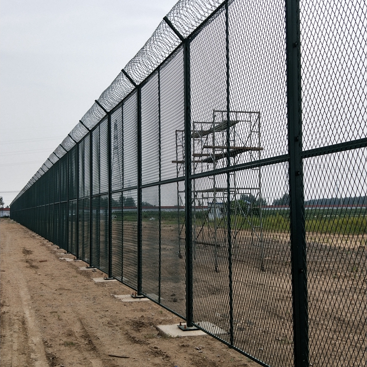 從結構組成來看,機場圍界網主要分為四部分:一是基礎結構,采用鋼筋混凝土澆筑地基,深度不低于0.8米,部分軟土地基需加深至1.2米,確保圍界抗風載、抗撞擊穩定性;二是網體主體,主流采用高強度鍍鋅鋼絲或不銹鋼絲焊接網片,網孔規格多為50mm×100mm或75mm×150mm,鋼絲直徑≥4mm,表面經浸塑或噴塑處理(顏色以草綠、深灰為主),兼具防腐蝕與隱蔽性;三是頂部防越設施,飛行區、油庫等重點區域圍界頂部,需加裝0.5-0.8米高的刀片刺網,刀片刺網采用交叉螺旋式安裝。四是輔助結構,圍界每隔3-5米設置混凝土或鋼管立柱,立柱與網體通過防盜螺栓連接,部分區域還會在圍界底部加裝防鉆鋼板,防止人員從底部挖洞入侵。