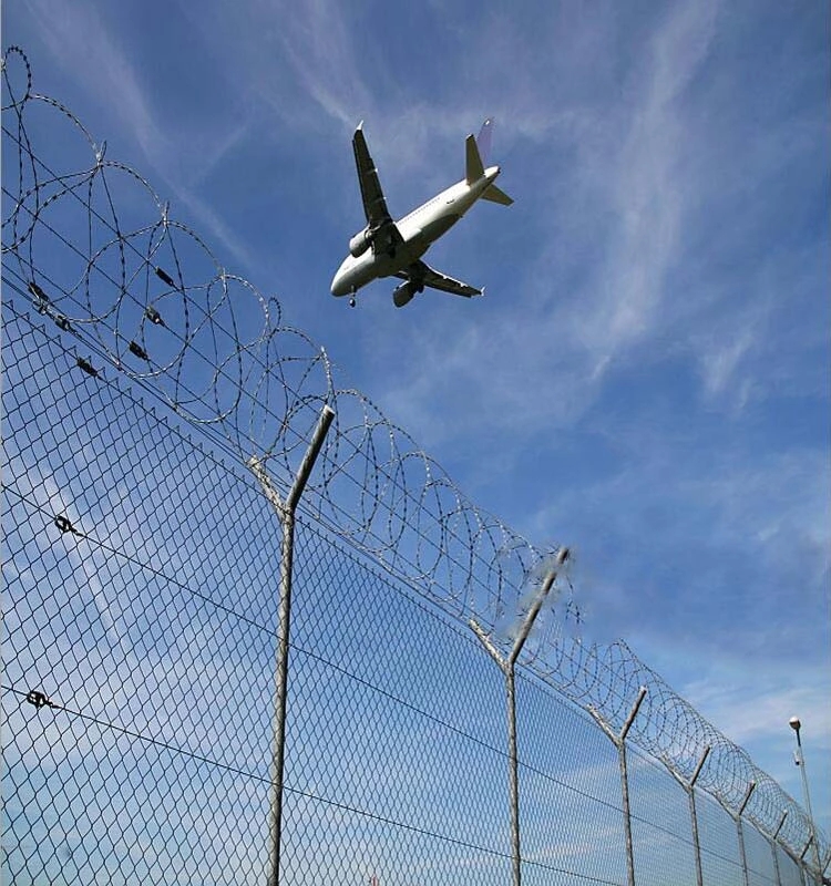 機場隔離網也稱為機場護欄網,機場圍界和機場防護網 它們是保護機場邊界,防止損壞機場設施,機場安全和使飛行更順暢的重要設施它由V形支撐柱,加固的焊接薄板網,安全防盜連接器和熱浸鍍鋅刀片倒鉤籠組成。 它具有很高的強度和安全防御能力。 近年來,這種形式的防護網已廣泛用于機場,軍事基地和其他高安全性場所。 機場隔離網頂部增加了刀片鐵絲網和刀片鐵絲網,以增強防護性能。