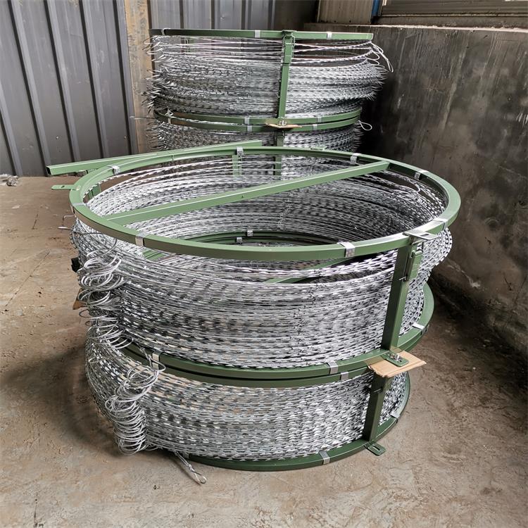 直線型刀片刺繩按照安裝方法不同可分為:(蛇腹式) 螺旋式刀片刺繩,直線型刀片刺繩,平板式刀片刺繩,刀片刺繩焊接網(wǎng)等。片刺繩按照安裝方法不同可分為:(蛇腹式) 螺旋式刀片刺繩,直線型刀片刺繩,平板式刀片刺繩,刀片刺繩焊接網(wǎng)等。 直線型刀片刺繩也稱(chēng)為刀片刺絲、刀片刺網(wǎng),是一種新型護(hù)欄網(wǎng)產(chǎn)品。它具有嚇阻效果好、美觀、施工便利,經(jīng)濟(jì)實(shí)用等優(yōu)異特點(diǎn)。主要用于園林公寓,機(jī)關(guān)單位,監(jiān)獄,哨所,邊防等的圈禁防護(hù)。直線型刀片刺繩由熱鍍鋅鋼板或不銹鋼薄板沖壓出尖銳的刀片狀,高張力鍍鋅鋼絲或者不銹鋼絲做芯線組合而成的阻絕器材。由于刺網(wǎng)造形獨(dú)特不易觸摸,因而能達(dá)到極好的防護(hù)隔離效果。產(chǎn)品的主要材質(zhì)有鍍鋅板和不銹鋼板。
