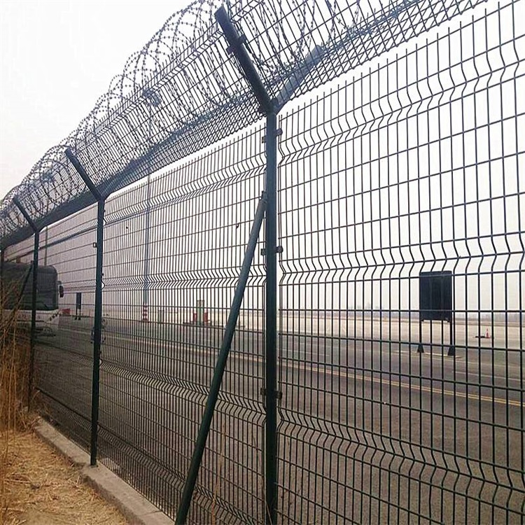 機場Y型柱角鋼隔離柵又被稱為刀片刺籠隔離網,機場Y型柱角鋼隔離柵最大的特點就是立柱頂端呈Y字型,上面架設刀片刺繩,大大提高了隔離柵的防御等級。該產品的網面與三角折彎隔離柵的網面是相同的,經過折彎處理增加強度四周焊接50x50角鋼,并且減少單調乏味。為了避免攀爬發生,頂端加設刺絲滾籠,這樣會增加嚇阻作用,起到防范,并且在外型上形成獨有的特點,令人過目難忘。