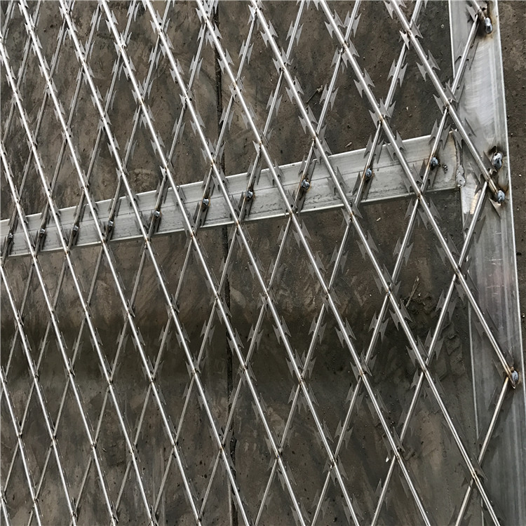 帶刺鋼絲護欄網分為刺繩護欄網和刀片護欄網刺繩護欄網是由低碳鋼絲表面鍍鋅擰編而成,毛刺鋒利使人難以穿越。刀片護欄網采用鋼板沖壓成型包附于鋼絲之上,由銳利尖角鍍鋅鋼板或不銹鋼薄板做刀片,高張力鋼絲做芯線組合而成的。鋒利的刀型刺由雙線扣裝后成蛇腹狀,既美觀又讓人不寒而粟。起到了很好的阻嚇作用。該產品具有美觀、防阻效果好、施工便利等優點。廣泛用于軍事重地、監獄、政府機關、銀行,以及生活小區圍墻、私人住宅、別墅的圍墻、門窗、高速公路、鐵路護欄以及邊境線等。