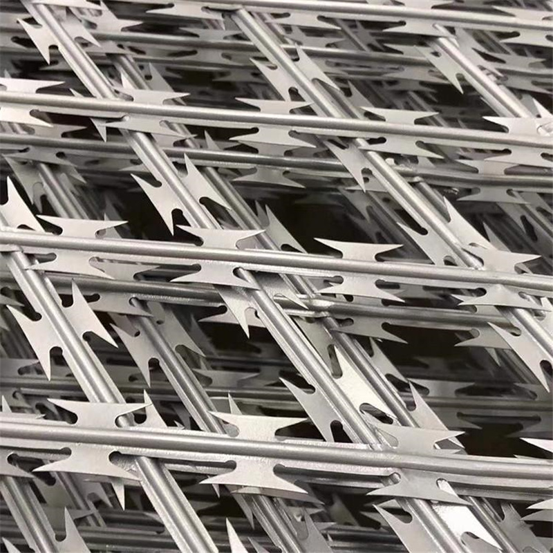 刀刺隔離網墻工藝:它采用鋼板(刀板)沖壓成型包附于熱鍍鋅鋼絲(芯線)之上,由銳利尖角鍍鋅鋼板或 不銹鋼薄板做刀片,高張力鋼絲做芯線組合而成的。