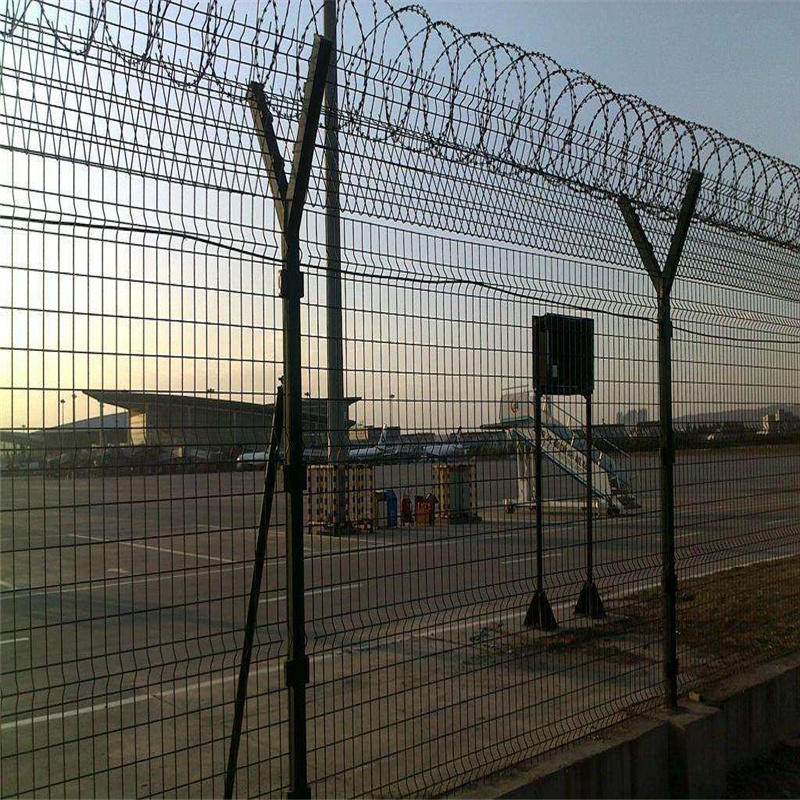 機場鋼筋網圍界飛行區鋼筋網圍界網面是由直徑5mm的鋼筋排列成矩形網格點焊形成,相鄰橫筋間距不大于10cm,相鄰豎筋間距不大于5cm.每片鋼筋網片寬度不大于3m,用螺栓固定在事先埋設好的立柱上.為增加圍界的穩定性,一般每30m左右增加一個斜撐.圍界上部50—60cm以30.一45.角向外傾斜,或設置滾筒形刺鐵絲網防止攀越。