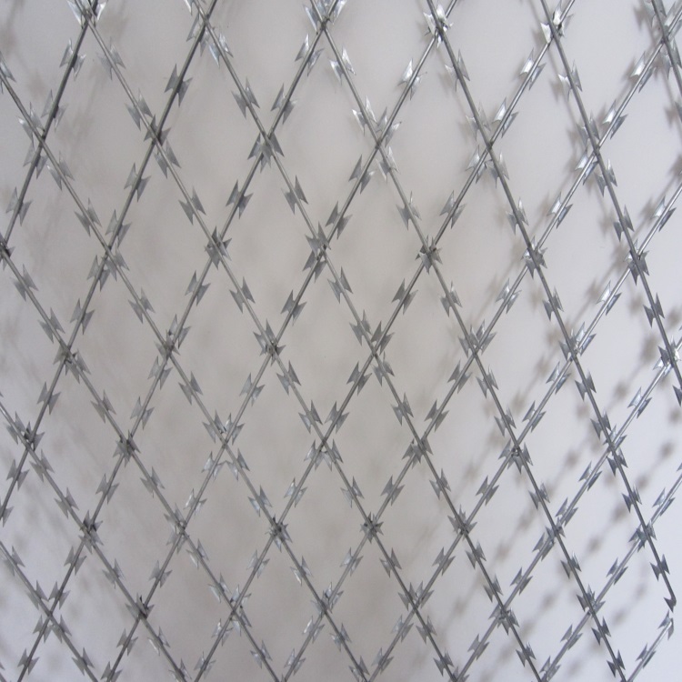 焊接刀刺圍欄網選用Q195L熱鍍鋅帶鋼(或者不銹鋼帶鋼),根據客戶選定的刀型,經高速沖床,沖軋成鋒利的刀片刺條, 把沖好的刀片裹在熱鍍鋅絲上面,經調直達到預定的長度自動切斷,送入到模具內,排焊機把經和緯相交叉的部分,沖過電流焊接到一起,數控電機拉動網片前進一格,達到網片的長度后,排焊機自動停止, 焊接刀片刺繩網制作完成。該生產工藝是根據電焊網片改進而成。