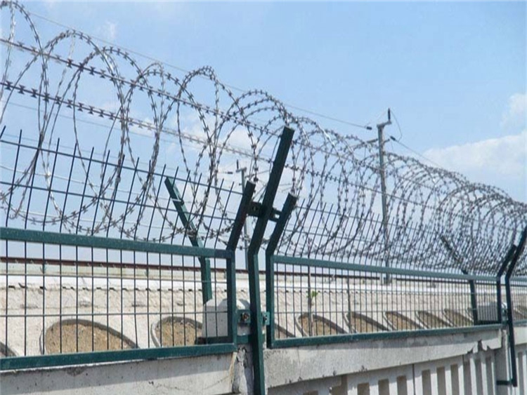 5、刀刺網(wǎng)隔離柵網(wǎng)片及刺鋼絲施工方法:按照規(guī)范要求進(jìn)行網(wǎng)片焊接、加工,加工完畢后進(jìn)行外部處理;運(yùn)至現(xiàn)場掛網(wǎng)安裝,之后進(jìn)行刺鋼絲的安裝;在放樣和定位工作完成的基礎(chǔ)上,根據(jù)要求進(jìn)行基礎(chǔ)及立柱施工,而后進(jìn)行網(wǎng)片安裝施工,進(jìn)行刺鋼絲施工。