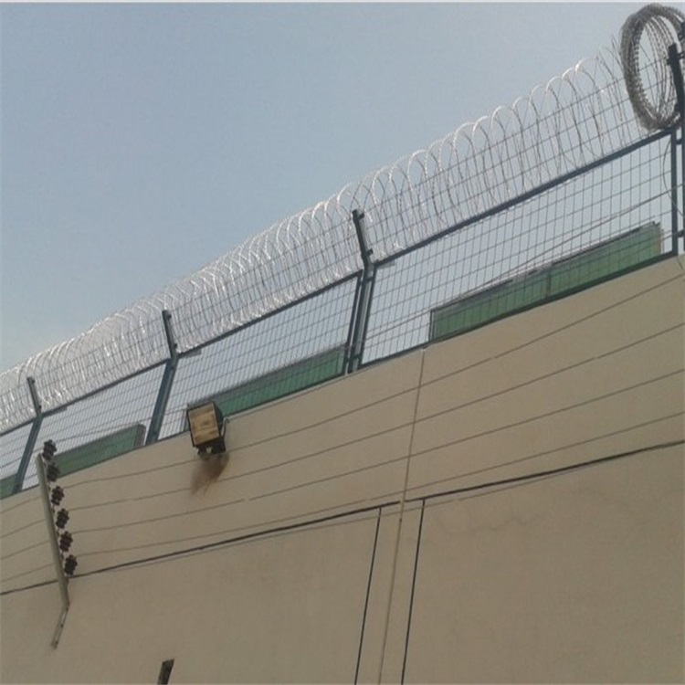 監(jiān)獄防攀爬護欄網(wǎng)首要分鍍鋅,浸塑兩種,是以立柱網(wǎng)片加刀片刺繩制造而成。