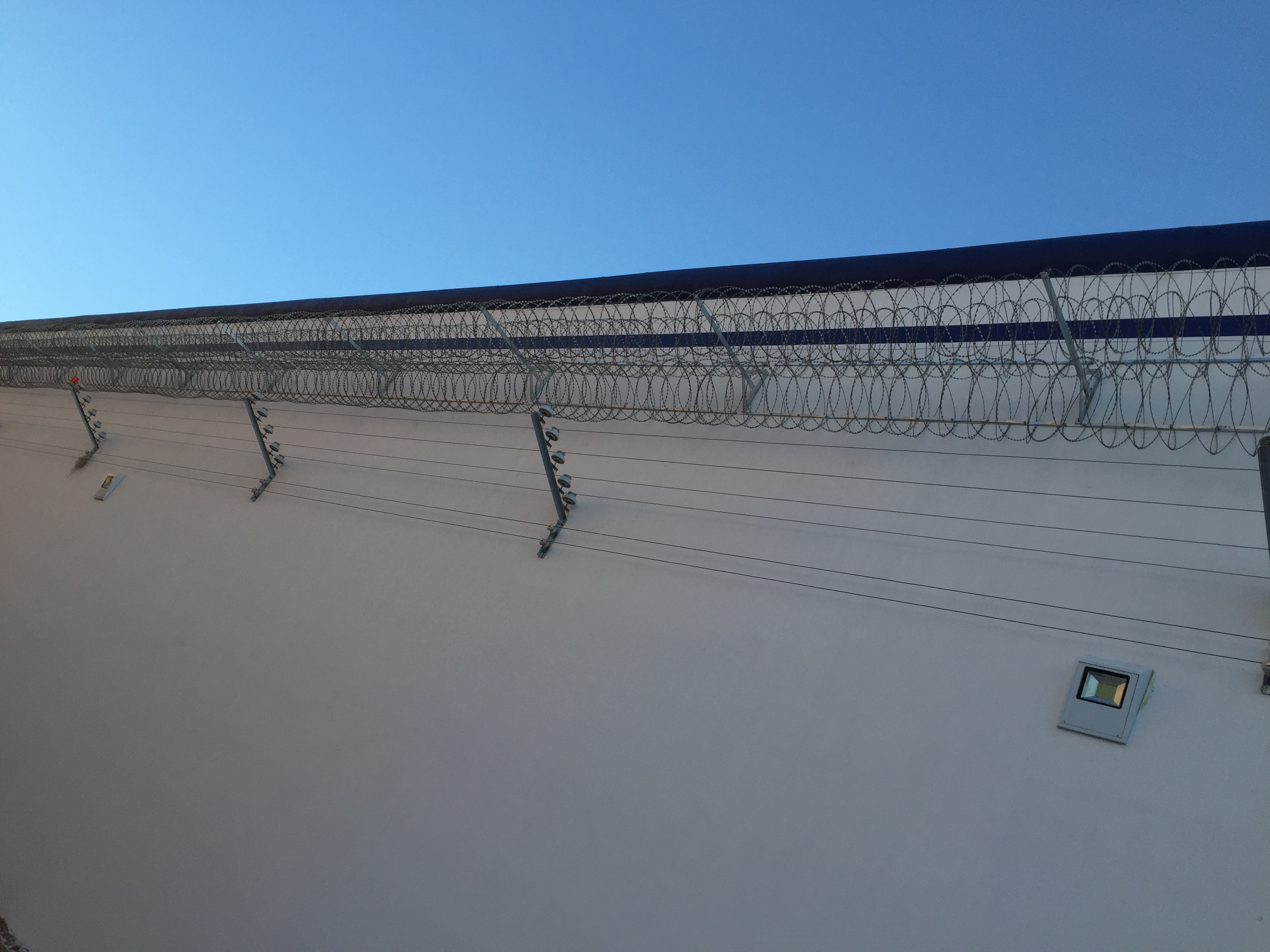 監(jiān)獄鋼網(wǎng)墻、看守所隔離網(wǎng)、機(jī)場圍界網(wǎng)等,大多在頂部用V型支架加裝蛇腹形刺刀圈,這種刺刀圈呈螺旋狀,一般多為不銹鋼材質(zhì),結(jié)構(gòu)新穎、堅固緊密、網(wǎng)面平整、網(wǎng)孔均勻、刀鋒銳利、防攀爬、抗腐蝕性強(qiáng)。